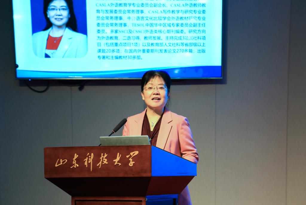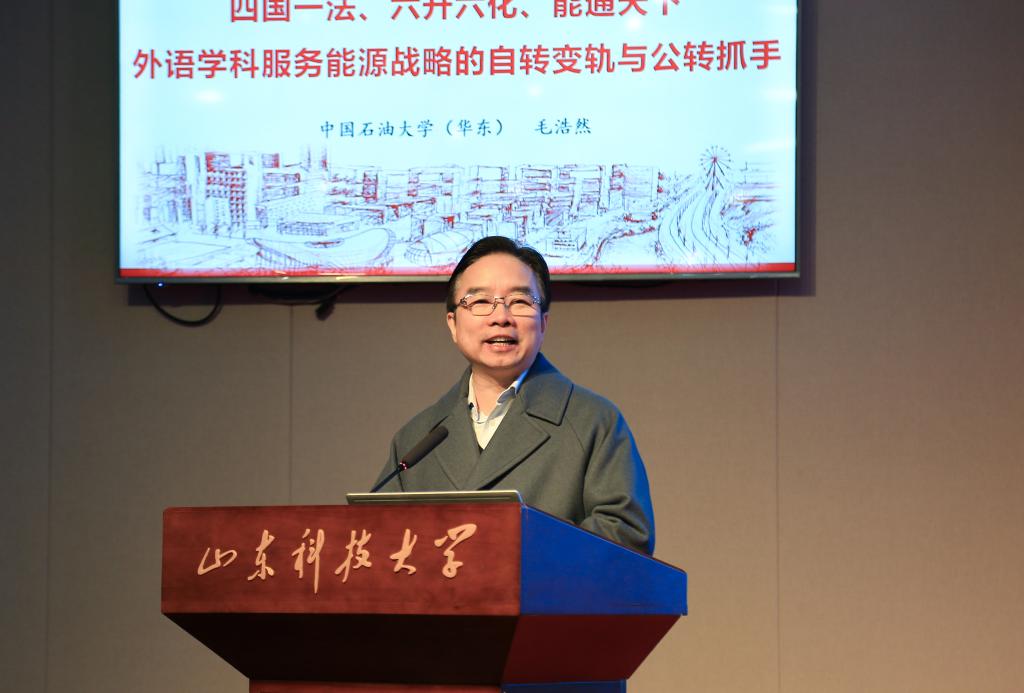中国石油大学(华东)毛浩然教授的报告为“四国一法,六升六化,能通天下:外语学科服务能源的自转变轨与公转抓手”。“四国一法”聚焦国际传播、国别区域、国际组织、健康中国与涉外法治,“六升六化”系统实施育人理念精英化、课程设置靶向化、教学场景实战化、实践平台国际化、选题价值战略化及学术资源集成化,构建“工具性+人文性+科学性+战略性”的思维体系,创新“多语种+X(AI、能源、工程、医学)”复合型培养模式,强化科教融合、产教融合与数智赋能,以更精准服务国家能源战略。