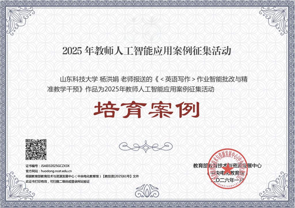 在2025年教师人工智能应用案例征集活动中,365官网杨洪娟老师报送的作品《<英语写作>作业智能批改与精准教学干预》荣获培育案例。