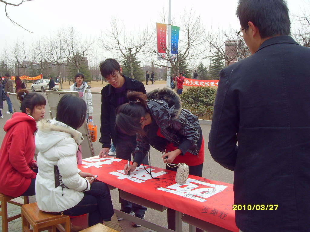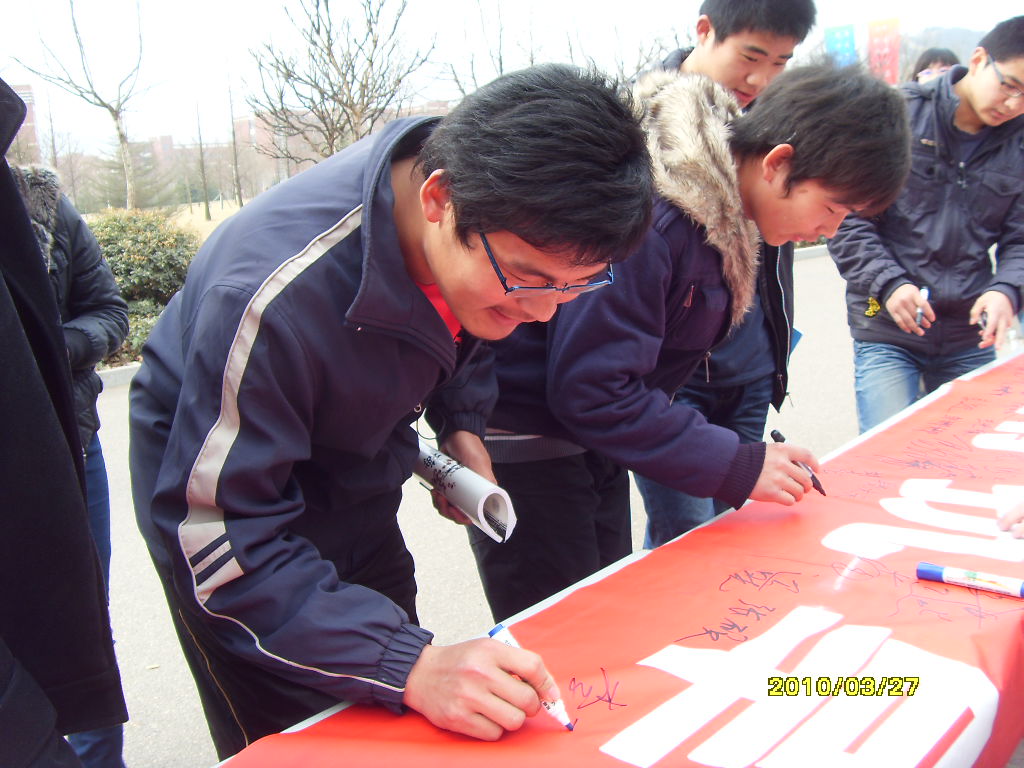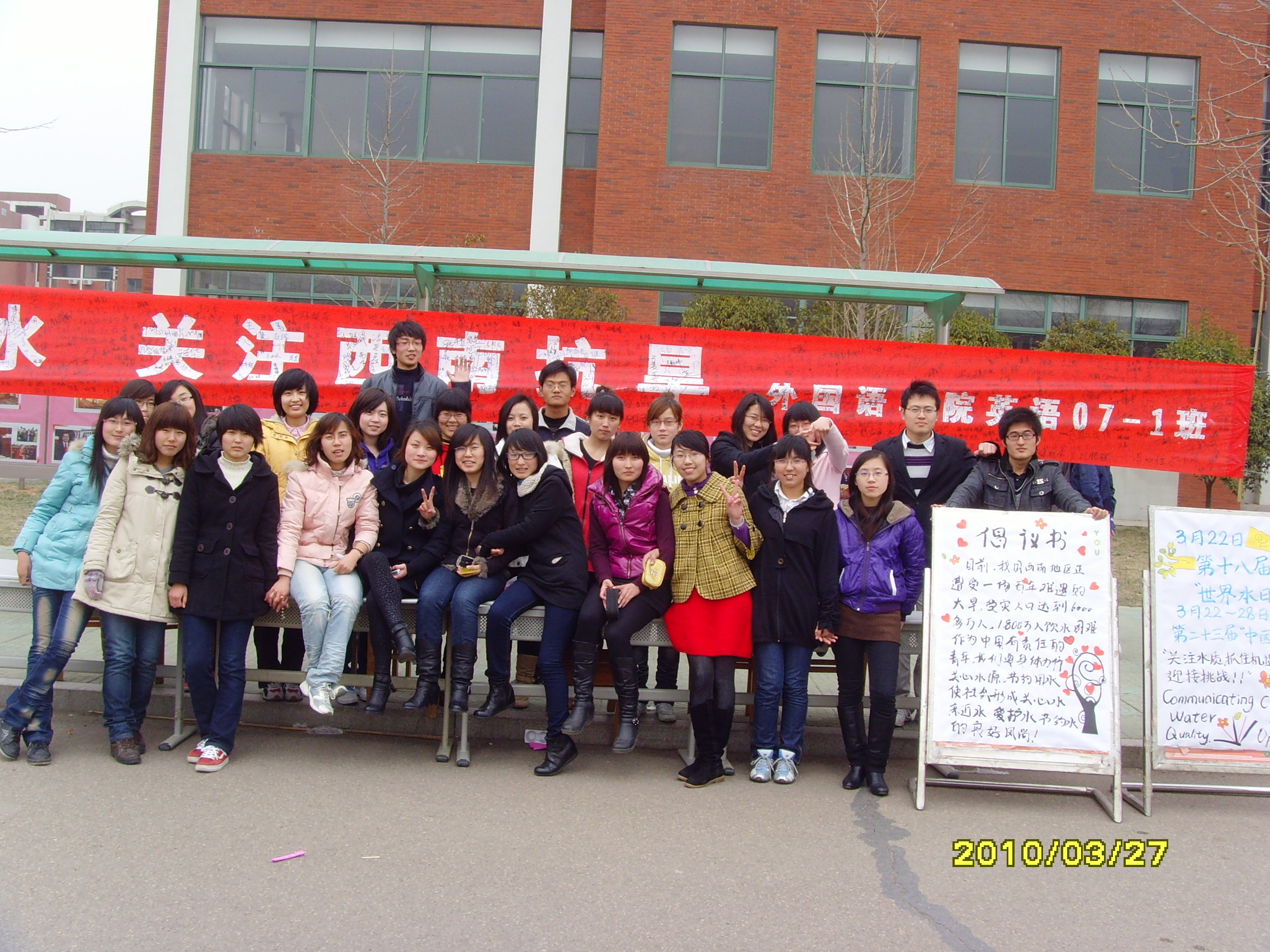 3月27日,beat365中国唯一官方网站英语07-1班在A区餐厅前成功举办了以“节约用水、关注西南抗旱”为主题的签名活动,旨在以3月22-28日“中国水周”的宣传为契机,呼吁在校大学生关注西南地区的旱情,并倡导同学们在生活中要身体力行,珍惜和节约水源。 此次活动提出了“关注水质、抓住机遇、迎接挑战”的倡议书,并邀请参观同学在横幅上签名,还展出了“干涸的黄果树瀑布”、“挖井的双手”、“总理的叹息”等与西南旱情有关的照片,以直观的视觉震撼,唤起当代大学生“节约用水、人人有责”的意识,并使更多的同学了解西南地区的旱情,关注抗旱的进展情况。