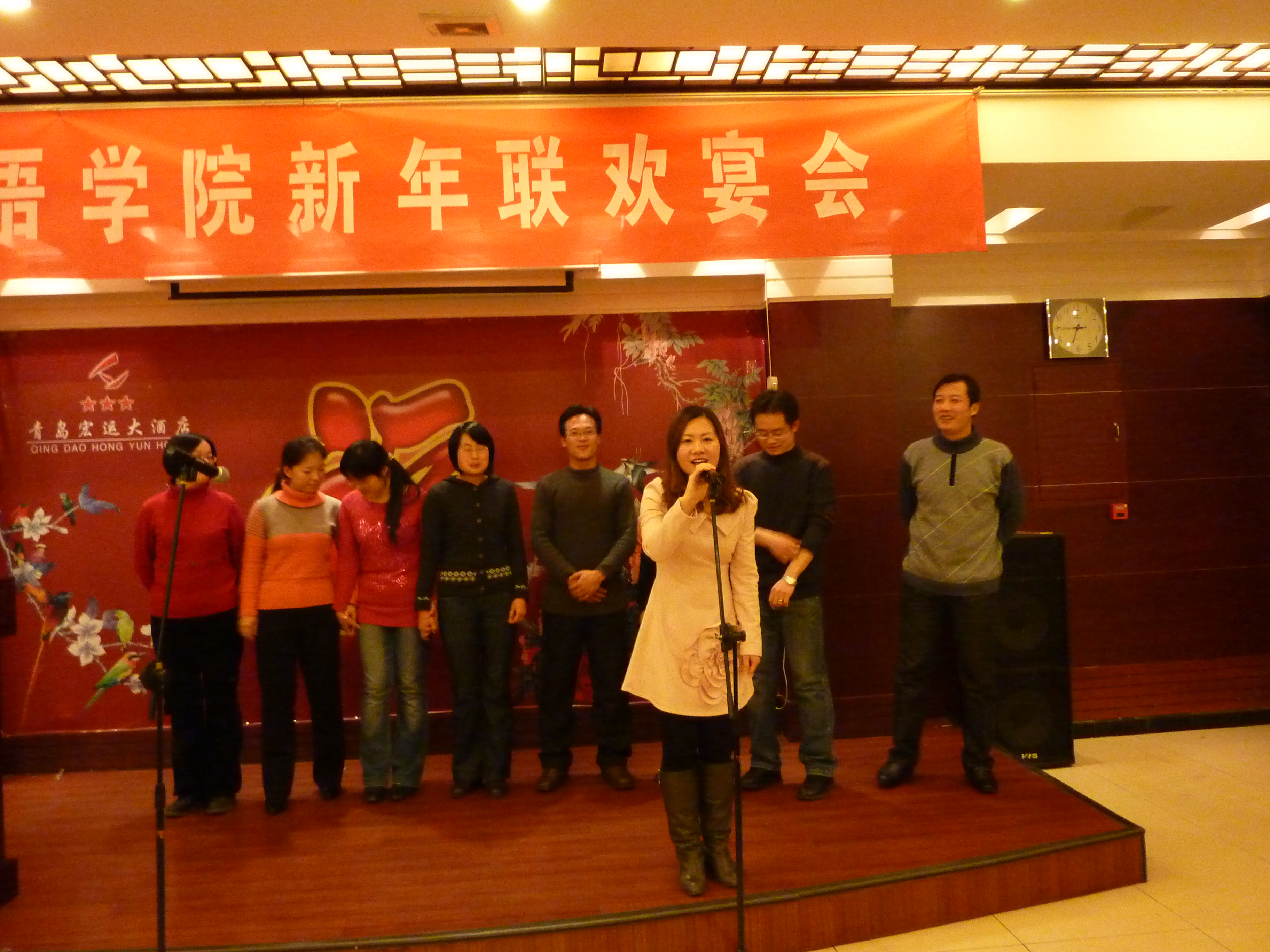 晚会现场笑意盈盈、其乐融融,院党委书记刘银轩代表学院党政发表了热情洋溢的新年祝词。学院教师精心准备的演出节目更是锦上添花,大学英语二系教师的一首《东方之珠》拉开了演出序幕。日语系、研究生教学部的日语、韩语歌曲让在场观众领略了别样的异国风情。高级英语教研室的《十送红军》曲声悠扬,韵味无穷。歌曲串烧动静结合,尽显唱功。尤其是大学英语一系教师创作的《三句半》更是将整个演出推向了高潮,作品形象地总结了学院一年来的变化和成就,由衷地表达了对学院的美好祝愿,共同描绘了学院的宏伟蓝图,赢得全场教工的一致认同,博得满堂喝彩。晚会在基础英语教研室的一曲《明天会更好》中落下帷幕。