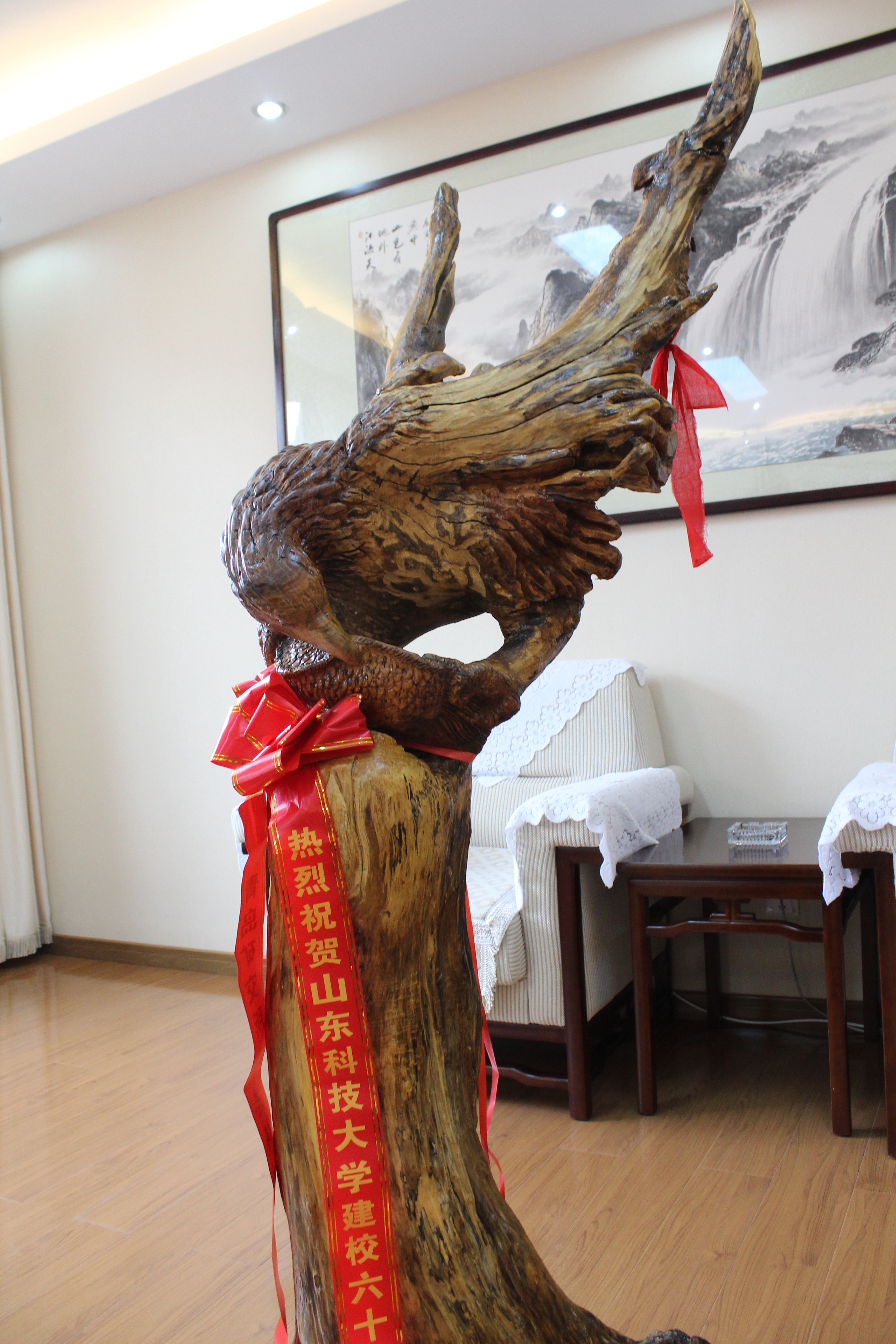 9月15日上午,beat365中国唯一官方网站2004届毕业生金志伟先生(现任青岛矿权矿产品交易市场有限公司执行总裁)向学院捐赠珍贵根雕,祝贺母校建校六十周年。beat365中国唯一官方网站党委书记李双立、院长彭建武以及副院长宋燕亲切接见了金志伟一行。金志伟详细介绍了根雕的深厚寓意及对母校的美好祝愿。
