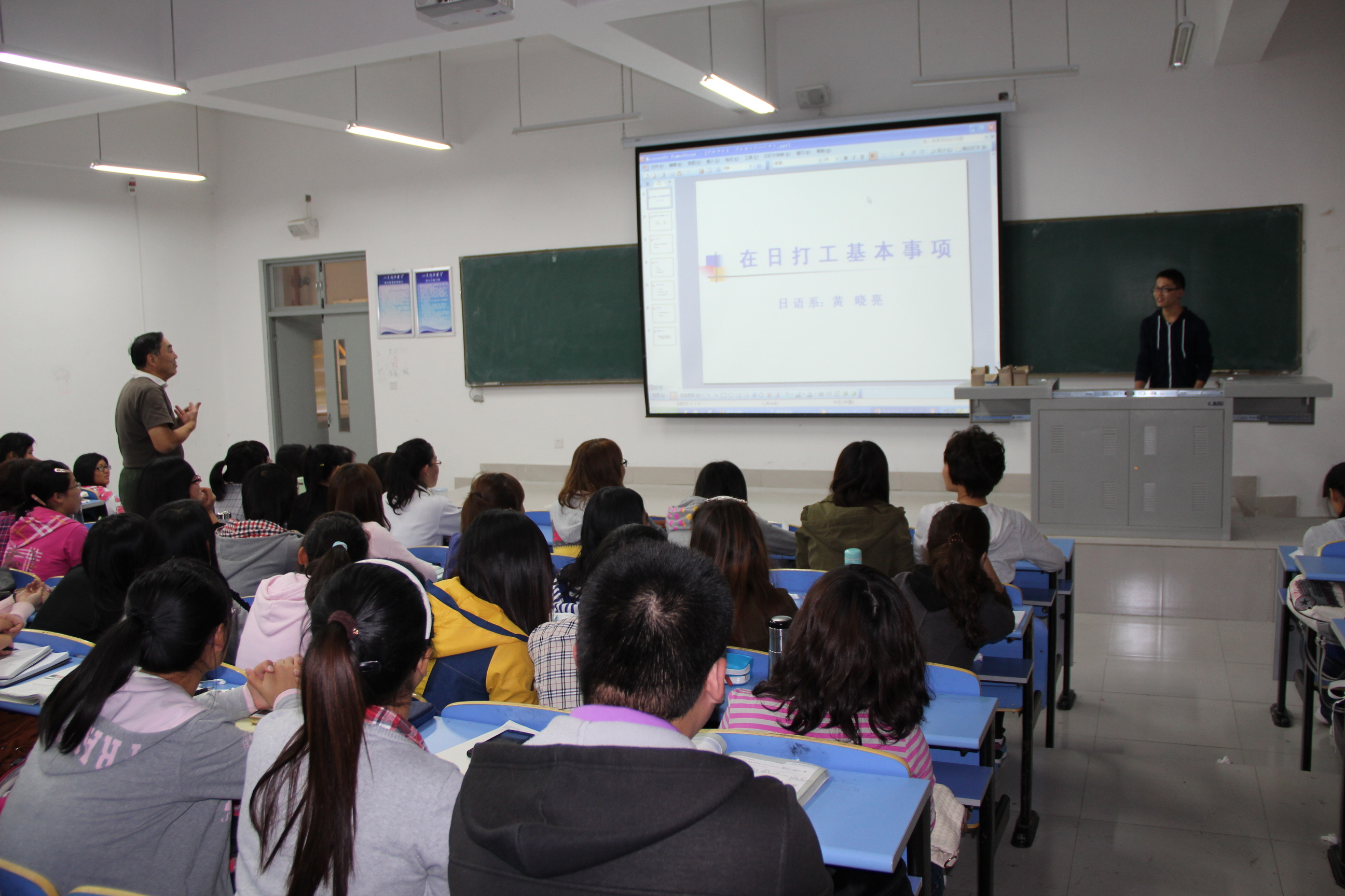 五位赴日留学学生分别从在日打工,参加的政治活动、在日旅行,日常生活以及学习五个方面为大家进行了介绍。黄晓亮为大家详细讲述了在日打工的基本事项,包括如何找工作,如何面试以及一些打工过程中需要注意的问题,并对在场同学提出的问题进行了解答。李亚琪为大家介绍了她在日本的旅游经历。带同学们领略了淳朴悠然的长崎,多情烂漫的豪斯登堡,古色古香的关西及辽阔壮丽的冲绳。在现场提问环节中,外教多次与留学生交谈,现场气氛达到高潮。(通讯员:吴晶晶 田玲)