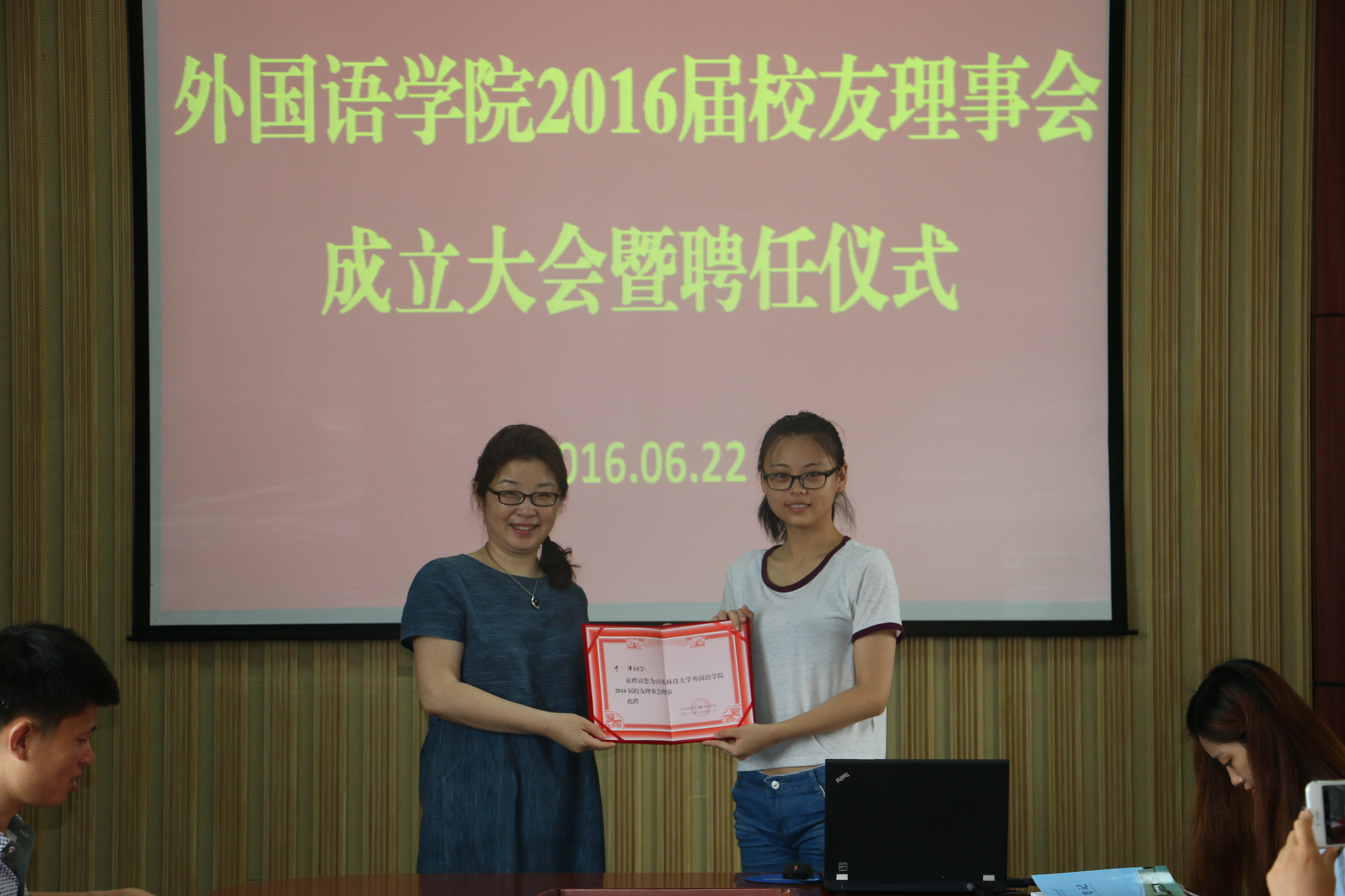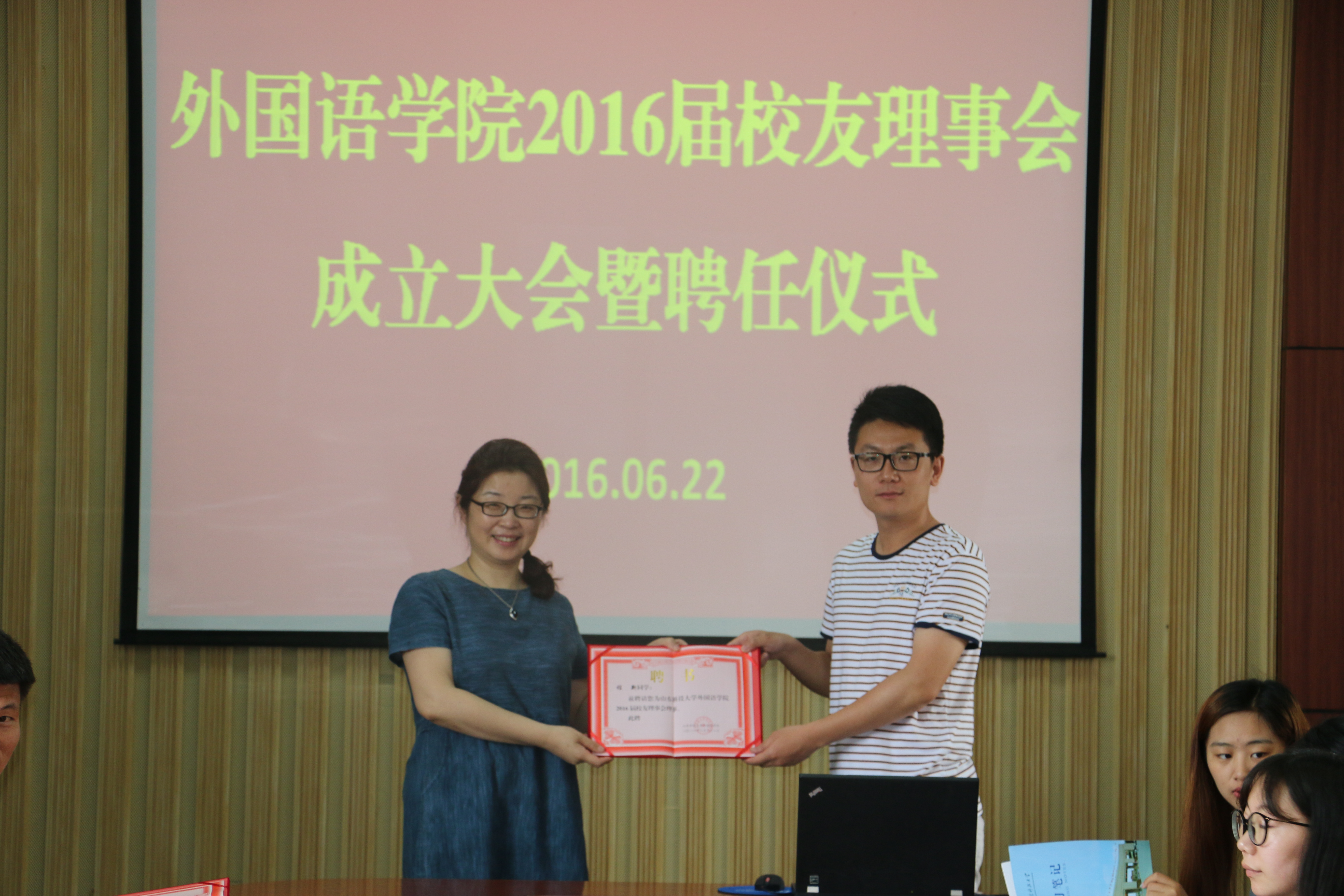 为加强学院校友工作体系建设,密切校友与学院之间的联系和沟通,6月22日,beat365中国唯一官方网站举行2016届校友理事会成立大会暨聘任仪式。beat365中国唯一官方网站党委书记李双立、院长唐建敏、党委副书记马海超、团委书记杜中华参加了此次仪式。党委副书记马海超主持仪式。 仪式上,马海超宣读了beat365中国唯一官方网站2016届校友理事会成员名单。唐建敏为本届校友理事会成员一一颁发了聘书并合影留念。本届校友理事会会长何珊珊代表理事会全体成员发言。 党委书记李双立在仪式上讲话,要求理事会成员牢记责任,不辜负学院和本届校友的期待与重托,认真履行好职责,发挥好桥梁和纽带的作用。希望大家做一个经常学习的人,做一个有信仰有理想的人,做一个会合作的人,做一个会感恩的人。(通讯员:韩兆飞)