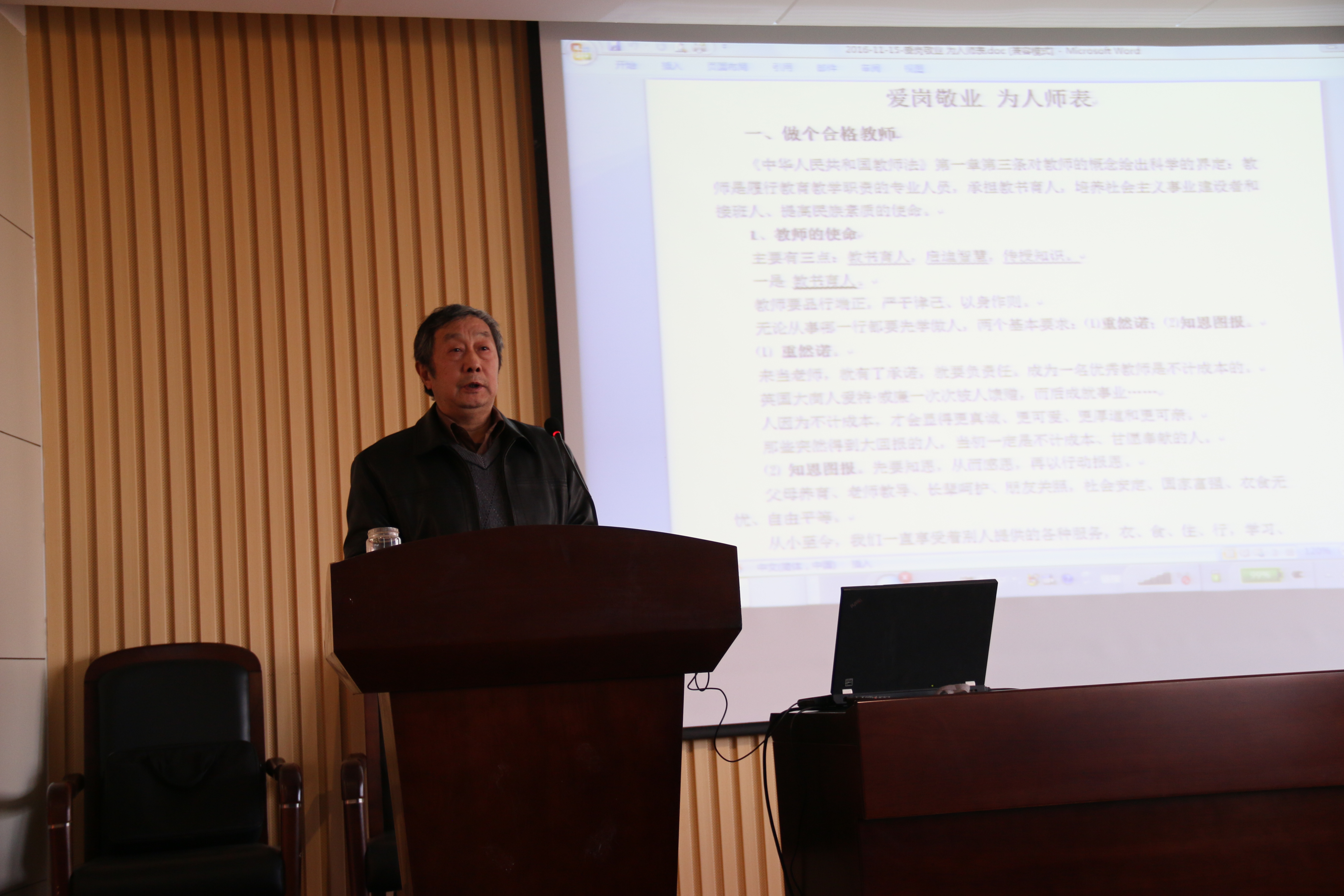 11月15日,beat365中国唯一官方网站的“秋实论坛”再次开讲。beat365中国唯一官方网站教学督导王世范教授为老师们做了题为“爱岗敬业 为人师表--做一个合格大学教师“的报告,beat365中国唯一官方网站院长唐建敏教授主持了报告会,学院全体教师到场聆听。
