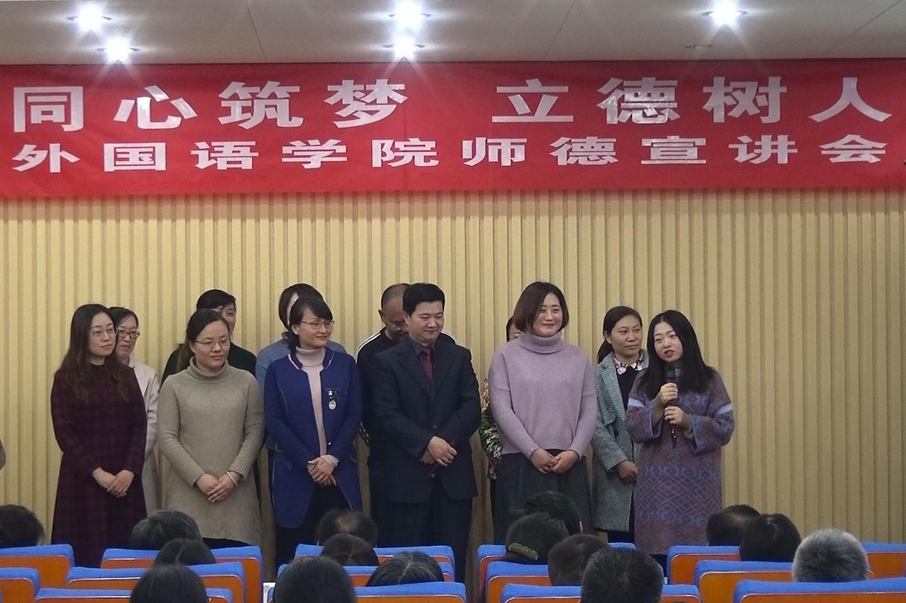宣讲会上,学院八个单位的教职工以朗诵、演讲、快板、音乐故事等多种形式,生动地展示了发生在自己身边教工身上“一支粉笔写春秋,三尺讲坛育桃李”的感人事迹。大学英语第二教研室全体老师的诗歌朗诵《你 我 我们》歌颂了敬业爱生、严谨治学的师德风范;房红芳老师讲述了学术英语教研室在教学、科研及各项活动中做出的不凡成绩;侯晓媛老师用欢快幽默的快板《小身体 大能量》展现了学院机关管理服务工作的热情、细致、周到、高效的点点滴滴;日语系马力老师道出了师者无悔无私奉献的真理;徐慧老师的《我斜对桌的大姐》讲述了中外文化教研室崔倩老师几十年如一日,舍小家为大家、甘于奉献、潜心育人的感人故事;王文老师以小见大,回顾了翻译系教师勤于探索、默默奉献、甘为人梯的感人事迹;英语系别俊玲老师的《静待花开》讲述了英语系庞燕宁博士在承担了繁重教学任务和家庭重担的同时,勤于治学,获批学院第一个国家社会科学基金项目的先进事迹;大学英语第一教研室全体老师以音乐故事的新颖形式,唱出了他们对师德的感悟……