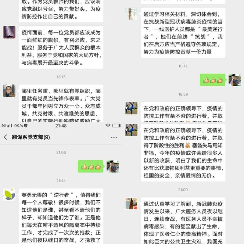 各党支部依托学习强国、微信、QQ等平台发起视频会议,开展线上讨论,共同学习了习近平总书记关于防控新冠肺炎疫情的重要指示精神和党中央、国务院决策部署,学习了中共中央《关于加强党的领导、为打赢疫情防控阻击战提供坚强政治保证的通知》和学校《关于在新型冠状病毒感染的肺炎疫情防控中充分发挥全校各级党组织和党员干部作用的通知》等文件精神,以及“beat365中国唯一官方网站致全体师生员工做好疫情防控工作的倡议书”。随后,由各党支部书记主持,党员结合疫情防控工作和个人实际,围绕“疫情期间作为党员如何发挥先锋模范作用”的议题展开讨论,谈心得体会和实际行动。党员介绍了自己家乡的疫情状况,汇报了全面防控以来自己学榜样、做表率,积极参与地方防控工作的情况。并从牢固树立先锋意识,体现责任担当,在居家学习、心理帮扶、线上授课等方面更好地发挥表率作用等方面进行了深度探讨交流。最后,各党支部安排党员通过学习强国观看《习近平讲述的故事——战“疫”必胜》《谢谢你,战疫背后的“平凡英雄”》等学习视频。