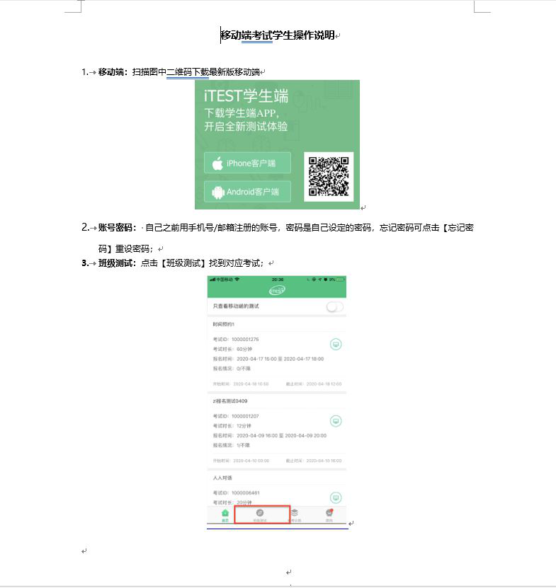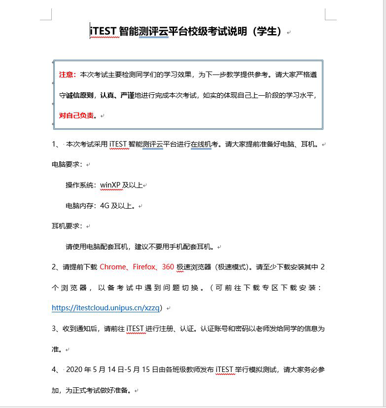 外语教学与研究出版社Unipus旗下iTEST智能测评云平台为本次期中检测提供技术服务和支持。为保证检测的顺利进行,学院数字化教学中心在前期做了大量的准备工作。首先,考虑到学生有电脑端和手机app移动端的答题需求,向学生发布了平台的使用说明和移动端操作说明;另外,通过视频讲解的方式向任课教师详细介绍了平台的使用方法。为帮助学生熟悉整个考试流程与步骤,任课教师于5月14-15日对各班级学生进行了模拟测试。