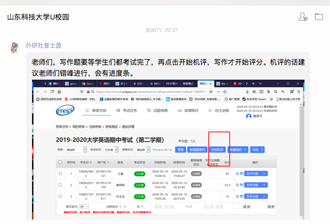 测试结束后,平台立即进行对学生的答题情况进行了评阅并给出评阅分数。本次检测不仅是对大学英语线上教学效果的检验,也是365官网进行线上测试的大胆尝试,为任课教师和学生提供了一次宝贵的学习和体验机会。公共外语教学部将基于本次测试的情况,进一步改进教学方法及教学评价方式,以达到更好的教学效果。 (图文来源:公共外语教学部)