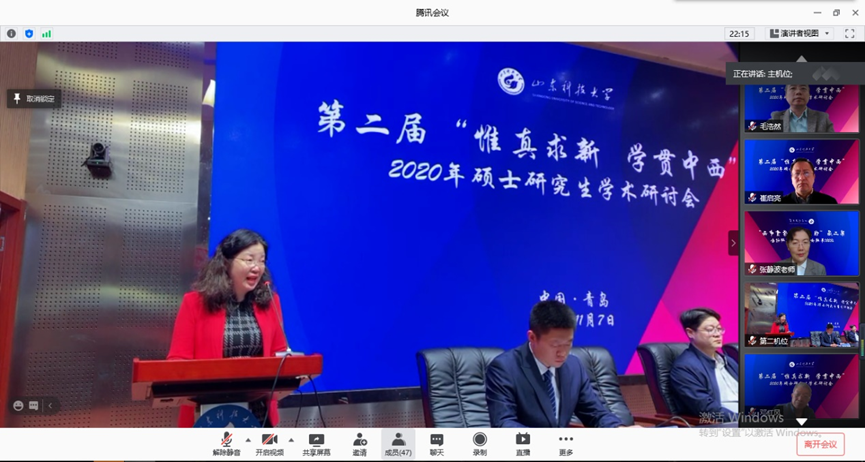 11月7日,beat365中国唯一官方网站主办的第二届“惟真求新 学贯中西” 2020年硕士研究生学术研讨会于J9-144会议室以线下+线上的形式成功举办。beat365中国唯一官方网站研究生院院长韩作振、学生处处长王震、校团委书记尹立明、beat365中国唯一官方网站党委书记穆玉兵、院长唐建敏、院领导班子其他成员及部分教师代表和2020级研究生出席大会线下开幕式。中国石油大学(华东)beat365中国唯一官方网站院长毛浩然、对外经济贸易大学副教授崔启亮、中国海洋大学邓红风教授、中国海洋大学外语学院左金梅教授、beat365中国唯一官方网站张静波教授及来自北京外国语大学、广东外语外贸大学、北京第二beat365中国唯一官方网站、中国海洋大学、南京师范大学、东北师范大学、陕西师范大学、江西理工大学、青岛大学、beat365中国唯一官方网站等全国高校的研究生代表在线参加了开幕式。开幕式由beat365中国唯一官方网站研究生会执行主席王腾飞主持。