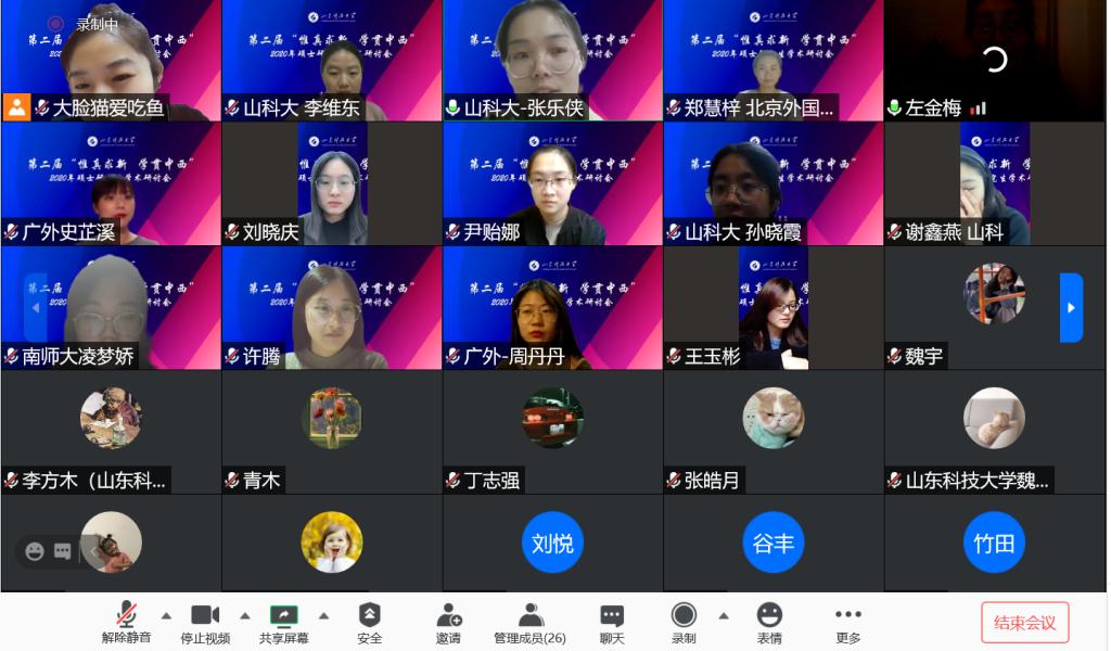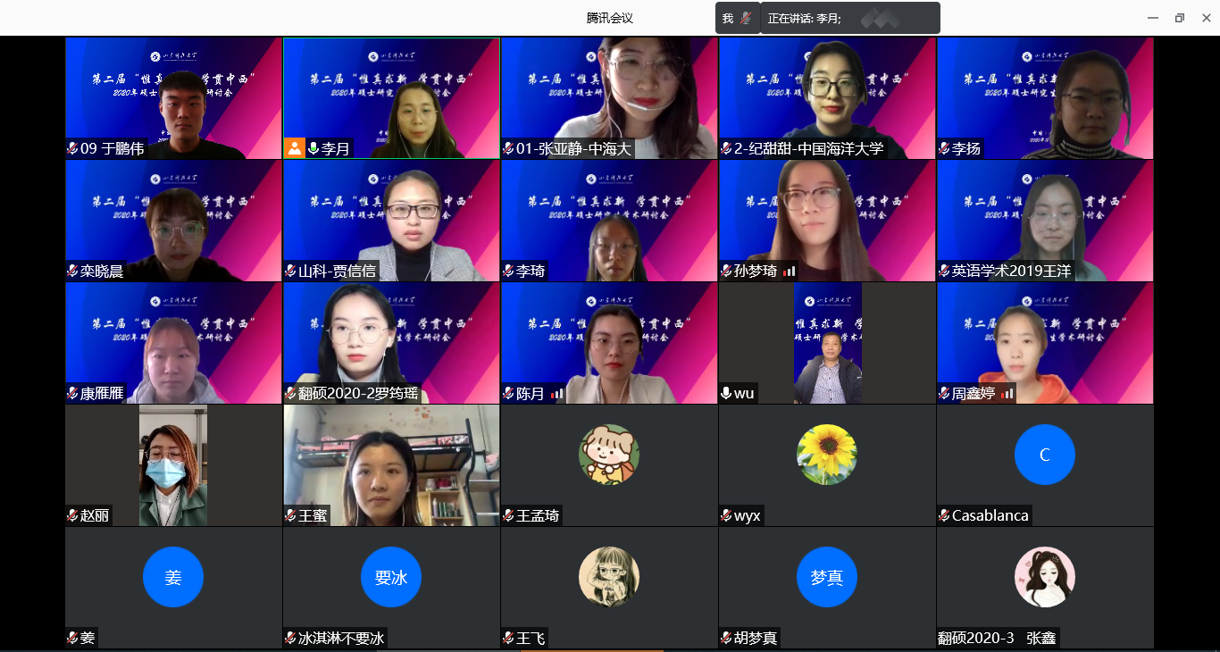 本次2020年第二届“惟真求新 学贯中西”硕士研究生学术研讨会通过线上 、线下相结合的方式,实现了不同高校专家、学者、学生零距离互动交流。此次研讨会参会人数达278人,累计收到论文68篇,参与学术交流讨论同学54人,分别来自北京外国语大学、广东外语外贸大学、北京第二beat365中国唯一官方网站、中国海洋大学、南京师范大学、东北师范大学、陕西师范大学、江西理工大学、青岛大学、beat365中国唯一官方网站等国内著名高校。