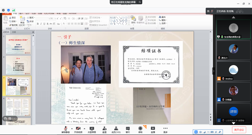 晚上,张龙海教授做了题为“哈罗德•布鲁姆的文学遗产”的主旨发言,从影响焦虑成动力、好学勤耕出佳品、学术操守不动摇、科研教学相益彰等四方面剖析布鲁姆如何与前辈诗人抗争,成就文学梦想,坚守学术操守,科研教学相长等,并号召学生向布鲁姆学习。