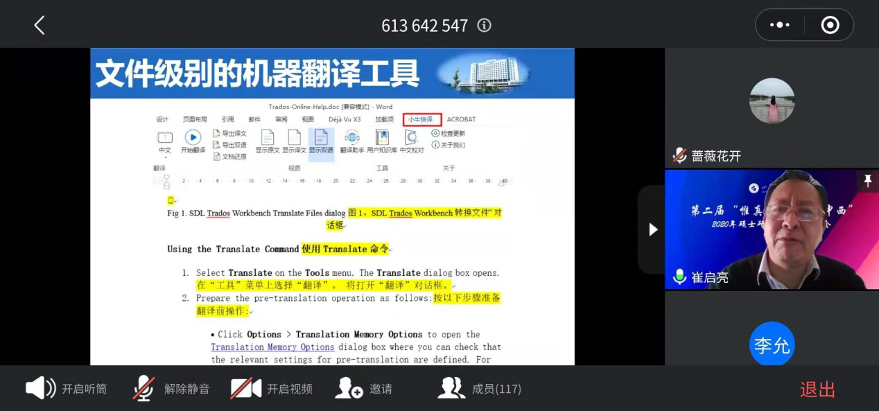 下午,崔启亮副教授做了题为“面向应用的翻译技术与工具实践”的主旨发言。分析翻译技术与工具广泛应用的驱动因素,对翻译技术进行分类,对翻译技术驱动的主要翻译方式进行案例分析,提出人机交互的翻译模型;根据不同的翻译对象的文本特征和文件特征,提出了翻译技术在文档、网站、影视、软件、移动应用的应用方式,总结了人工智能时代译者的信息技术能力。