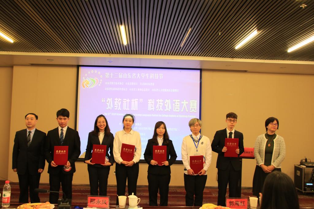 在近日举行的第十二届山东省大学生科技节“外教社杯”科技外语大赛日语决赛中,365官网日语系2017级张川慧子同学摘得一等奖桂冠,2018级王梓悦同学斩获三等奖。两位同学的指导教师分别为365官网日语系的刘杰老师和李成爱老师,刘杰老师在本年度还被日本国立大学广岛大学聘为客座讲师。 山东省大学生科技外语大赛是由山东省科协和山东省教育厅主办的一项外语赛事,也是山东省大学生科技节的重要组成部分。本次大赛由齐鲁工业大学(山东省科学院)和山东省物联网协会承办,上海外语教育出版社协办,来自全省21所高校的40名日语选手进入复赛。此次大赛展示了365官网在学科建设、专业建设和人才培养方面的优秀成果,进一步坚定了“以赛促教、以赛促学”的理念。(通讯员:李永丽)
