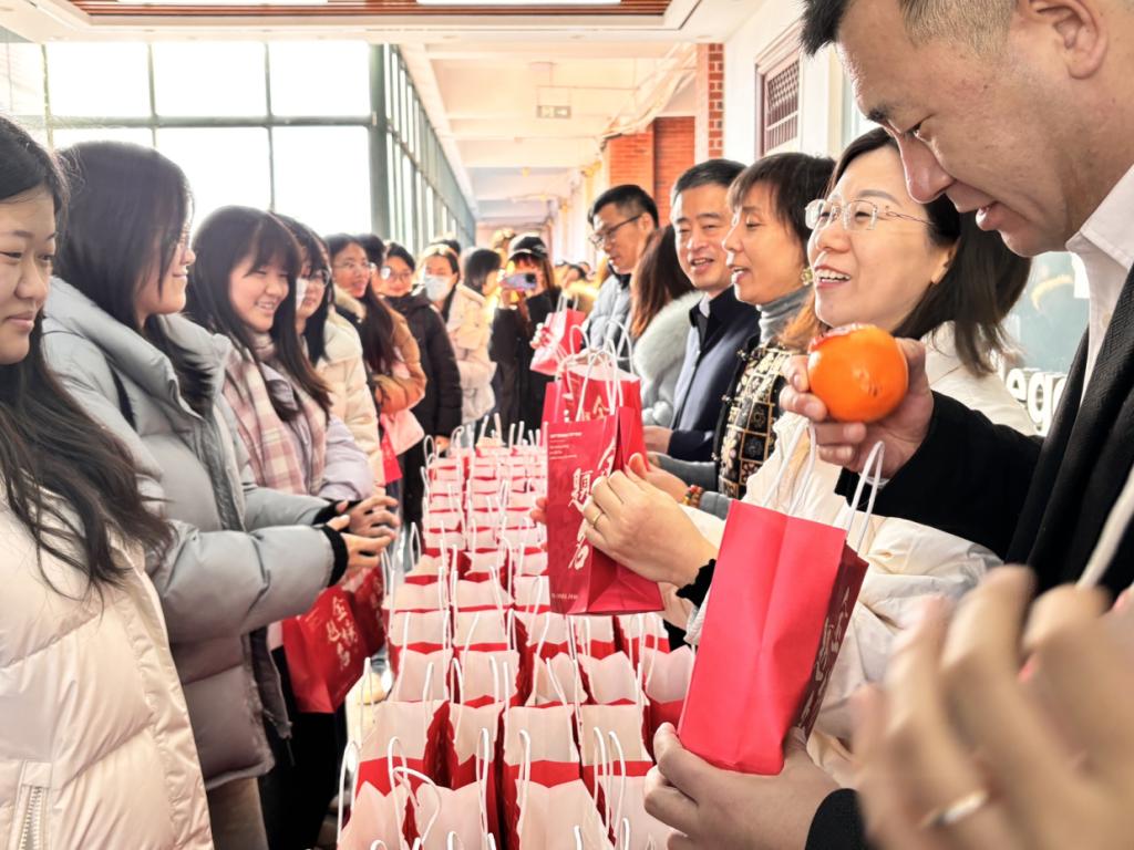 学院领导、教师代表与同学们亲切交流,细致询问复习进度与备考状态,勉励大家坚定信心、稳扎稳打,在最后冲刺阶段注意复习节奏、劳逸结合,调整好状态迎接考试。随后,老师们为同学们逐一发放考研暖心礼包。礼包内包含多种寓意美好的物品:象征“心想事成”的橙子,饱含着对同学们梦想成真的期许;“神思焕发”的咖啡,助力大家在漫长征途中保持专注与活力;“好运常旺”的旺仔牛奶糖,为同学们带来好运连连的祝愿;“温暖相伴”的暖贴,在寒冷冬日为大家送上丝丝温暖;还有往届优秀学长学姐亲笔写下的祝福贺卡,传递着过来人的经验与鼓励。每一份精心挑选的礼物都承载着学院对考研学子的殷切期盼,为他们的奋斗征程增添融融暖意。同学们收到礼包后纷纷表示,学院的关怀令人倍感温暖,也更加坚定了他们迎考必胜的决心与信心。