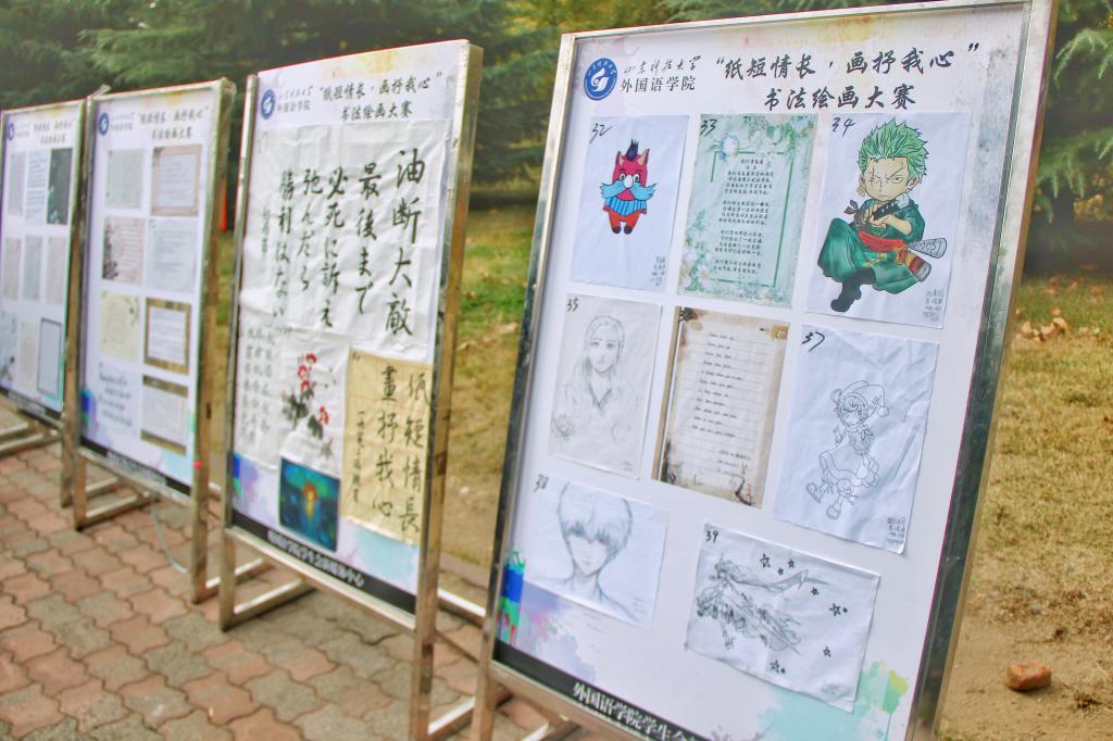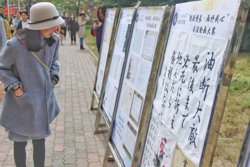本次展览分为书法、绘画两个主题。其中,书法作品涵盖中文、日文、英文、朝鲜文四种文字,内容既包括文雅端庄的唐诗宋词,也不乏彰显青年人活力的励志名言。作品风格各有千秋,汉字或刚劲有力,或飘逸飞扬,英文艺术字明朗有质,书法作品中外交融、东西合璧,各色各样的纸张上绽放出书法艺术的绚丽之花,有力彰显beat365中国唯一官方网站的外文优势与多元文化的魅力。绘画作品包括人物漫画、中国画。鲜亮明快的笔触勾勒出生动活泼的人物形象,展现作者对人的洞悉。水墨丹青之间,花草奇石塑造出悠远雅致的禅境空间。精美的艺术作品引来路人驻足欣赏,观赏者俯身细品、相互交流、点头称赞,时常取出手机拍摄下心仪的作品,并积极为最佳作品投票。本活动优秀作品将在微信公众号“嵙外语好声音”展览。