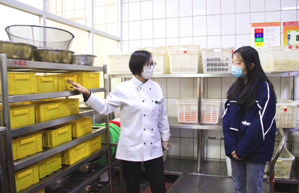 本次活动的主要内容是参观了解后厨运行、体验后厨工作开展,让同学们切实感受到餐厅工作者的辛苦以及食物的来之不易。杜中华对餐厅的基本情况进行了详细地讲解,使同学们对后厨工作分工的精细程度有了大致了解。后厨工作人员的操作间内,清洗池干净整洁,各类物品分类清晰,大到每一台机器,小到每一张抹布、每一个餐具都有具体的分类和记录。另外,根据蔬菜、肉类处理方法不同,选择的工具也不同。除此之外,每一位班组成员都对自身严格要求,进后厨会更换统一的工作服并佩戴卫生头套,保证菜品的卫生健康。在疫情特殊时期,餐厅更是严格把控,所有工作人员需每14天做一次核酸检测,确保自身安全的同时也保障就餐人员的健康安全。在餐厅内,各个角落都布置了以节约粮食为主题的展牌及提示语,时时刻刻提醒同学们节约的重要性。全体参与人员通过聆听讲解、亲身体验等方式,对学苑餐厅的餐饮结构、后勤工作以及同学们的就餐情况进行了了解。