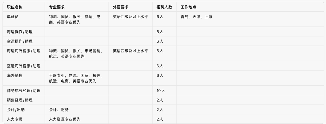 一、公司简介 中锐物流致力于为客户提供端到端全球物流供应链解决方案。业务范围涵盖了租船(散杂货/重吊船/滚装船)、EPC工程物流、进出口国际海运、进出口国际空运、车辆项目物流、铁路及国际多式联运、大件运输、报关报检、仓储、集散码头、保税物流、保险代理、技术支持咨询等服务。公司致力于构建海、陆、空、铁综合物流完整产业链,创新物流解决方案,一体化的全球物流供应链服务商。二、招聘岗位