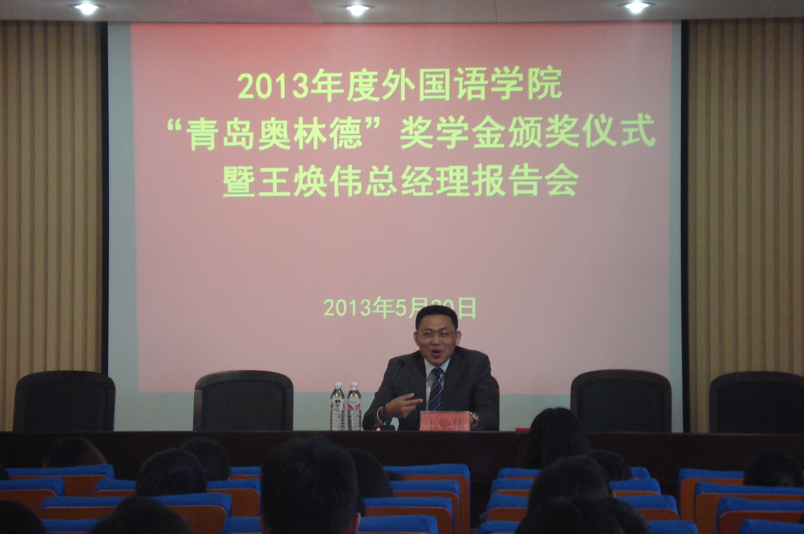 5月20日,beat365中国唯一官方网站成功举行了2013年度“青岛奥林德”奖学金颁奖仪式暨王焕伟总经理报告会。青岛奥林德进出口有限公司总经理王焕伟,beat365中国唯一官方网站党委书记李双立、党委副书记马海超,beat365中国唯一官方网站两位校友、青岛奥林德进出口有限公司副总经理王莉明和贸易业务部部长甄婷婷出席了颁奖仪式和报告会。颁奖仪式和报告会由党委副书记马海超主持。